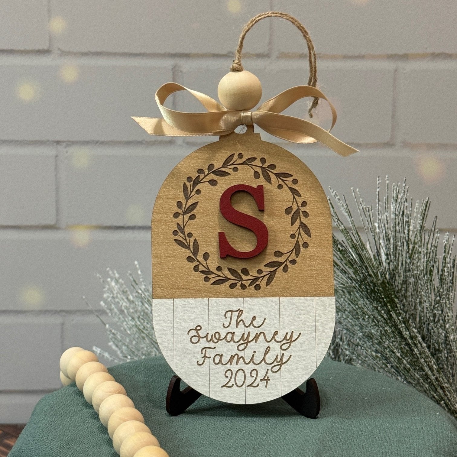 Beautiful farmhouse style Christmas wreath monogram ornament. Great gift for family or friends, newlyweds or anyone! Made from engraved draftboard/whiteboard, maple and a burgundy monogram. Finished with jute twine, a large wooden bead and a shimmery gold satin ribbon.